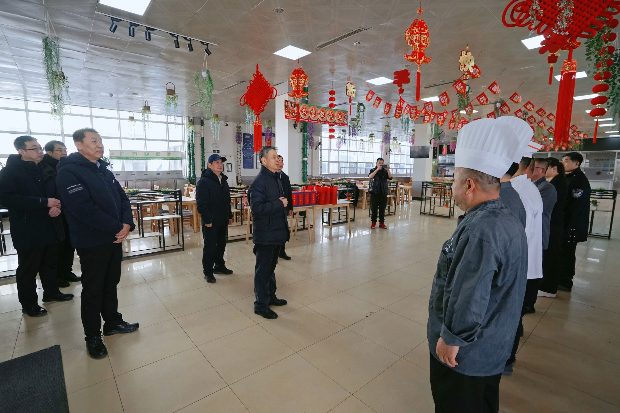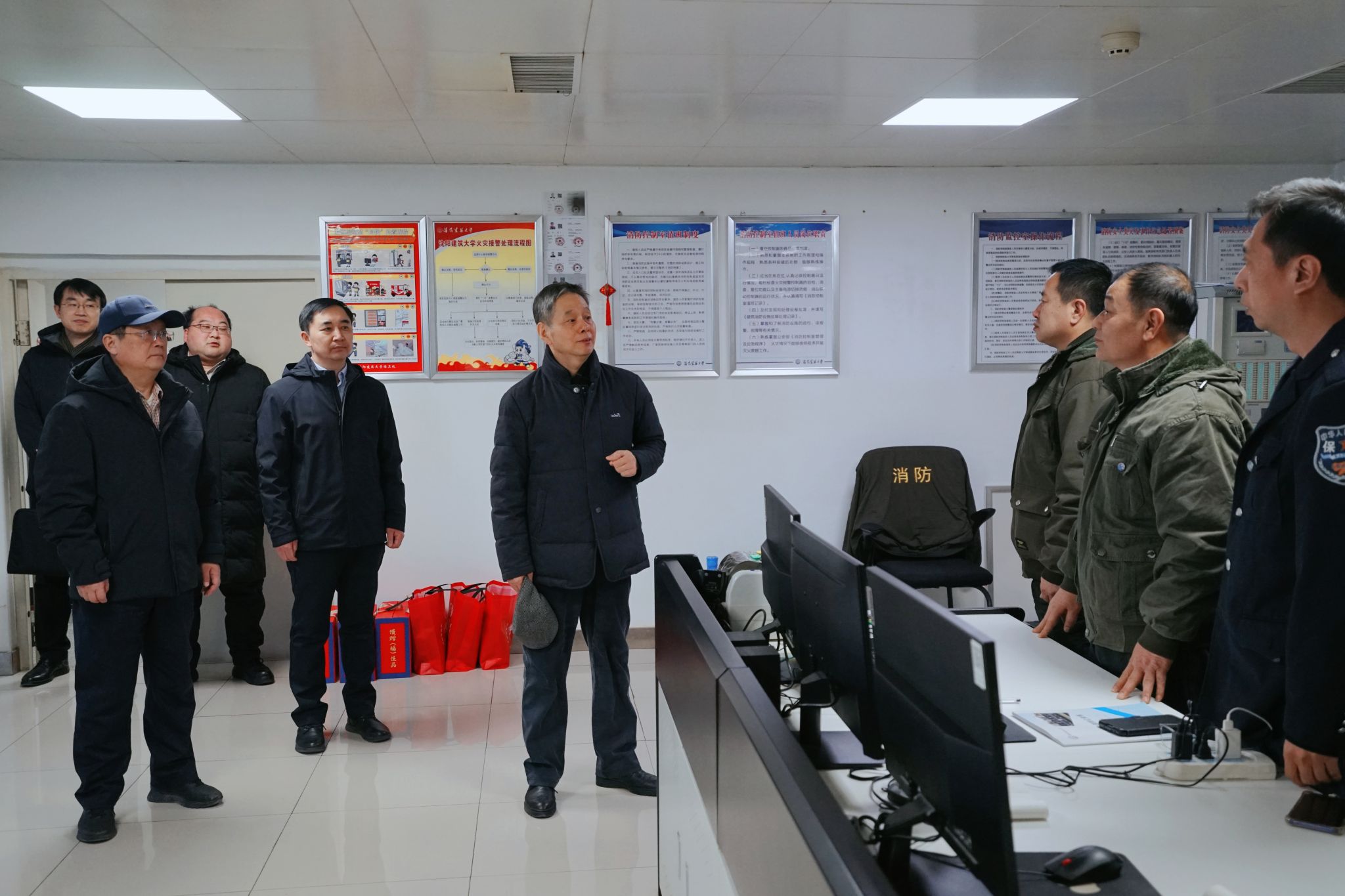 校领导一行先后走访了办公楼值班岗、保卫处监控指挥中心、学校正门值守点、换热站运行机房及第二餐饮中心,与在岗的值班人员、安保队员、供暖保障人员、食堂服务人员亲切交流,详细了解春节期间的值班安排、生活保障和工作运行情况。感谢大家舍小家、顾大家,默默坚守在保障校园运行的第一线,为全校师生度过一个平安、温暖、祥和的春节保驾护航。