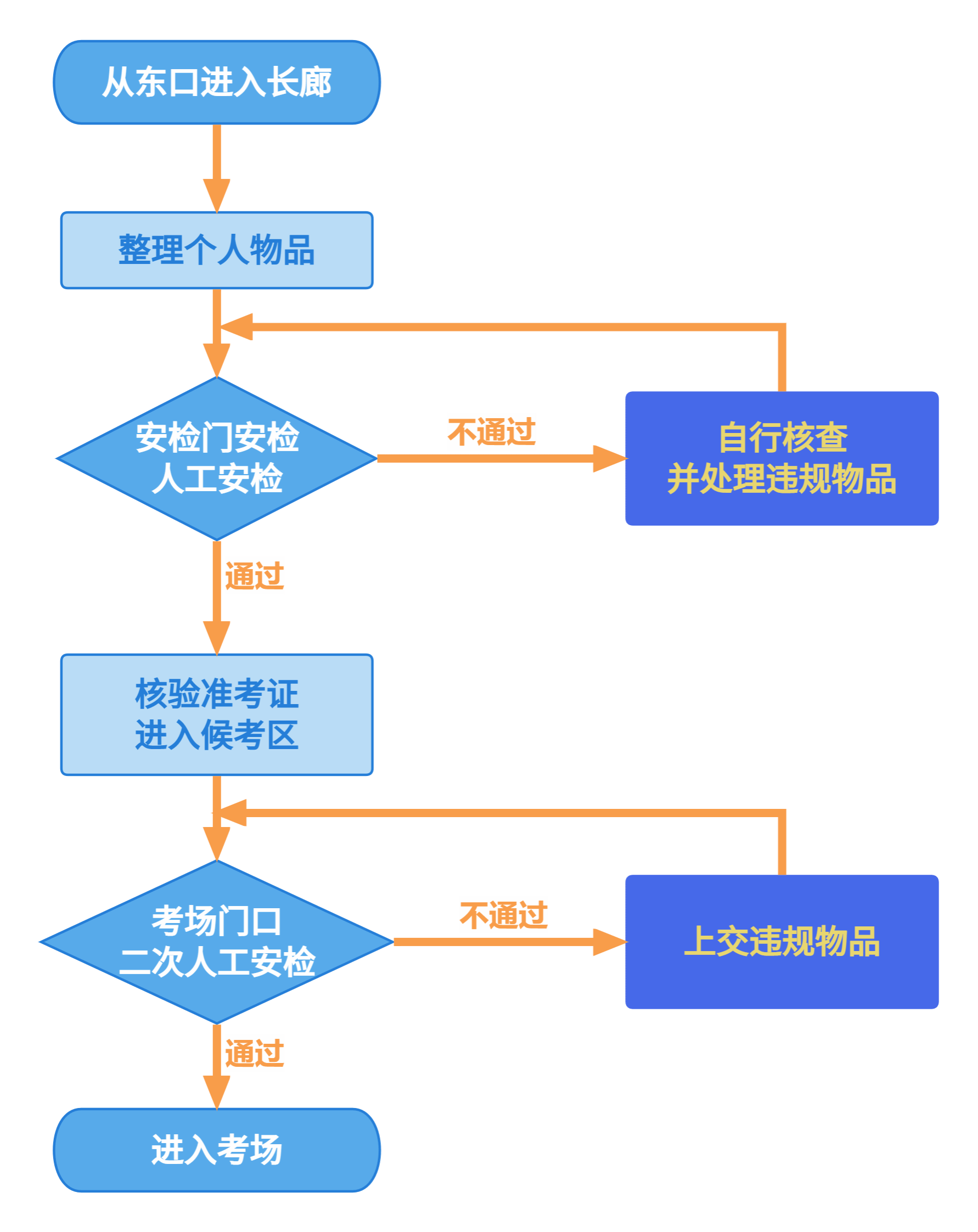(1)研考入场设置智能安检门检查环节,考生须主动接受安检,依次通过智能安检门检验后方可进入考场封闭管理区域。考生不得携带手机、智能产品(智能手表、手环等)、无线耳机等具有通讯功能的电子产品或具有拍照功能物品进入长廊候考区域。建议考生在考试当天不携带磁卡、打火机、金属手镯、戒指、项链等物品,不穿戴有金属装饰品的衣服、鞋帽、发卡等,避免反复安检,影响正常入场考试。如因个人原因影响正常入场考试,由考生本人负责。