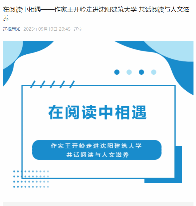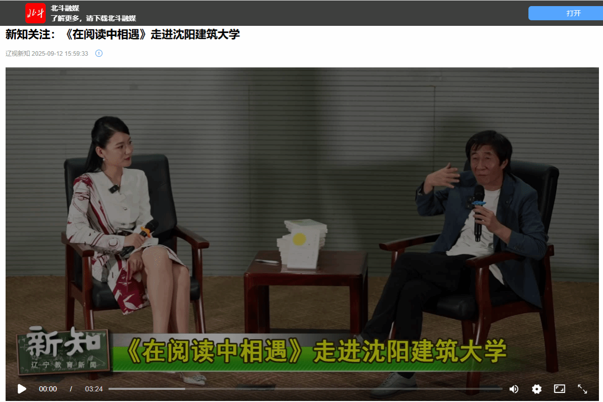 编者按:当理性与诗意交融,当工程智慧邂逅人文光芒。9月10日,《在阅读中相遇》系列访谈节目走进沈阳建筑大学,著名作家王开岭,为建大师生带来了一场深度的人文对话,在书香氤氲中探讨阅读如何构筑精神家园、涵养专业灵魂,照亮未来建设者的心灵之路。北斗融媒、辽宁广播电视台青少频道《新知》栏目对此进行了宣传报道。现将相关报道转载如下: