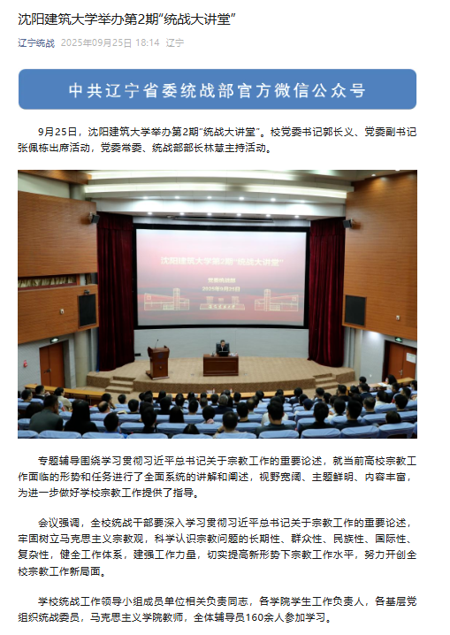 编者按:9月25日,沈阳建筑大学举办第2期“统战大讲堂”。校党委书记郭长义、党委副书记张佩栋出席活动,党委常委、统战部部长林慧主持活动。省委统战部微信公众号对此进行了宣传报道。现将相关报道转载如下: