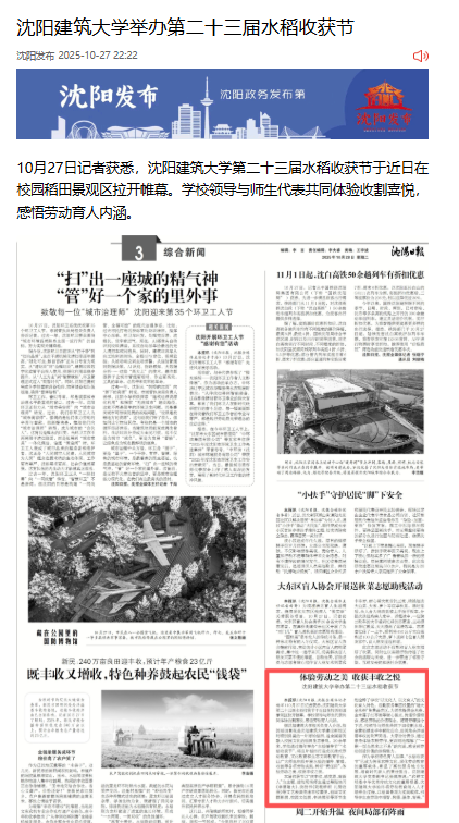 编者按:金秋时节,稻浪飘香。10月22日,沈阳建筑大学第二十三届水稻收获节在校园稻田景观区拉开帷幕。师生代表共同体验收割喜悦,感悟劳动育人内涵。光明日报、学习强国、辽宁日报国际传播中心、沈阳日报对此进行了宣传报道。现将相关报道转载如下: