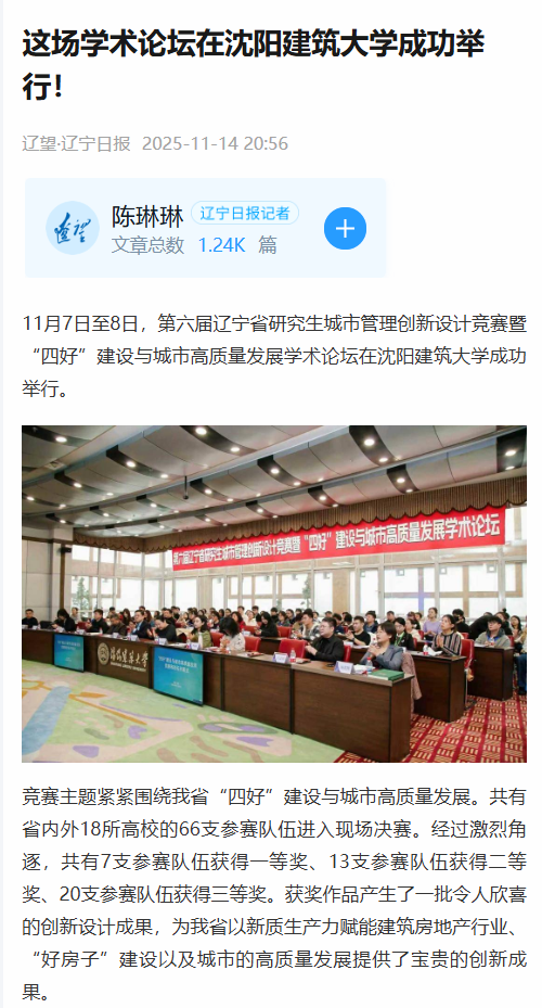 编者按:11月7日至8日,第六届辽宁省研究生城市管理创新设计竞赛暨“四好”建设与城市高质量发展学术论坛在沈阳建筑大学成功举行。辽望·辽宁日报对此进行了宣传报道。现将相关报道转载如下: