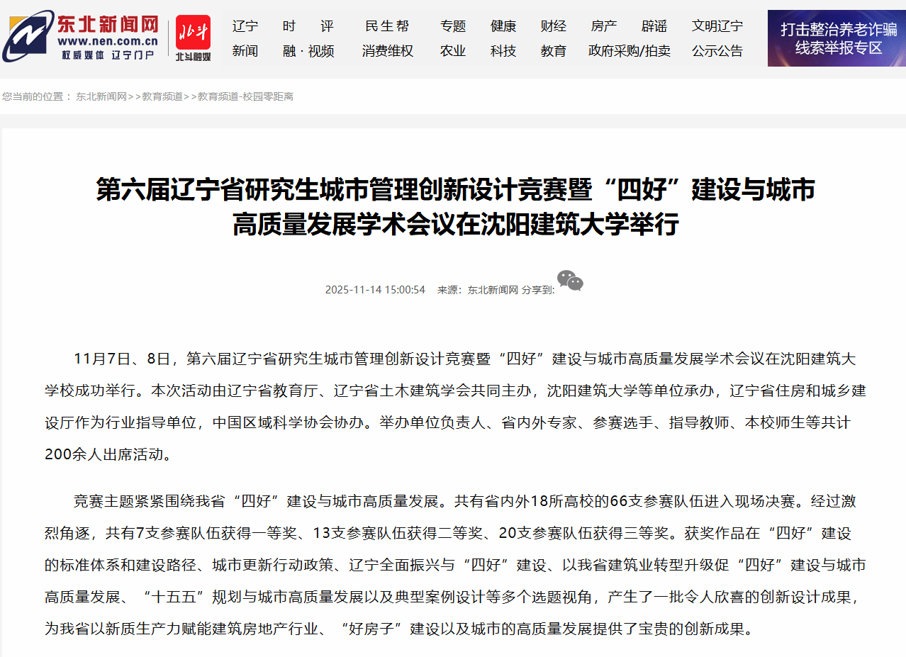 编者按:11月7日、8日,第六届辽宁省研究生城市管理创新设计竞赛暨“四好”建设与城市高质量发展学术会议在沈阳建筑大学校成功举行。本次活动由辽宁省教育厅、辽宁省土木建筑学会共同主办,沈阳建筑大学等单位承办,辽宁省住房和城乡建设厅作为行业指导单位,中国区域科学协会协办。东北新闻网对此进行了宣传报道。现将相关报道转载如下: