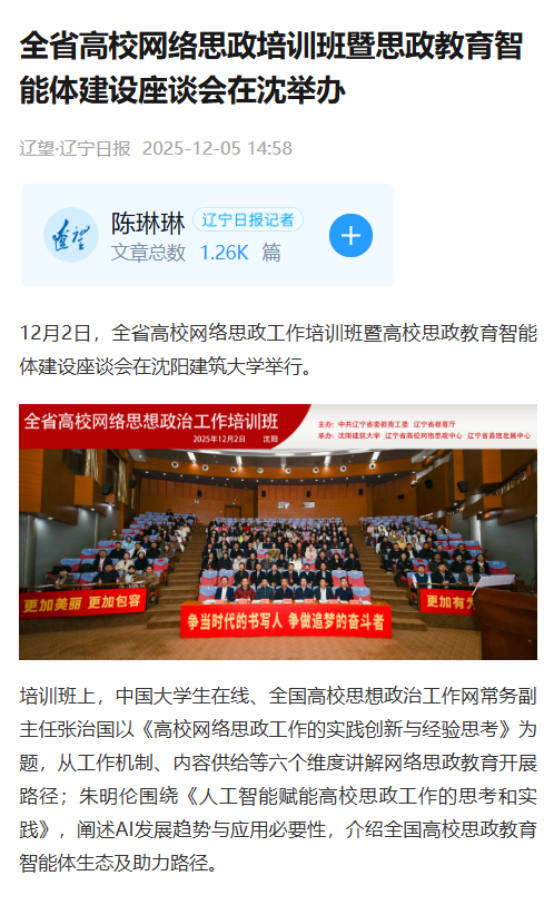 编者按:12月2日,全省高校网络思政工作培训班暨高校思政教育智能体建设座谈会在沈阳建筑大学举行。教育部易班发展中心主任朱明伦,中国大学生在线、全国高校思想政治工作网常务副主任张治国,省教育厅二级巡视员龚建斌,沈阳建筑大学党委副书记张佩栋出席开班式,省内各高校相关中心负责人参训,省委教育工委宣传部负责同志主持开班式。辽望·辽宁日报对此进行了宣传报道。现将相关报道转载如下: