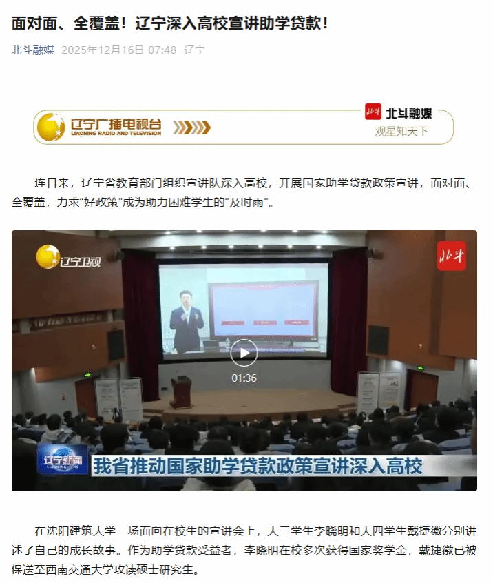 编者按:连日来,辽宁省教育部门组织宣讲队深入高校,开展国家助学贷款政策宣讲,面对面、全覆盖,力求“好政策”成为助力困难学生的“及时雨”。辽宁新闻、北斗融媒对此进行了宣传报道。现将相关报道转载如下: